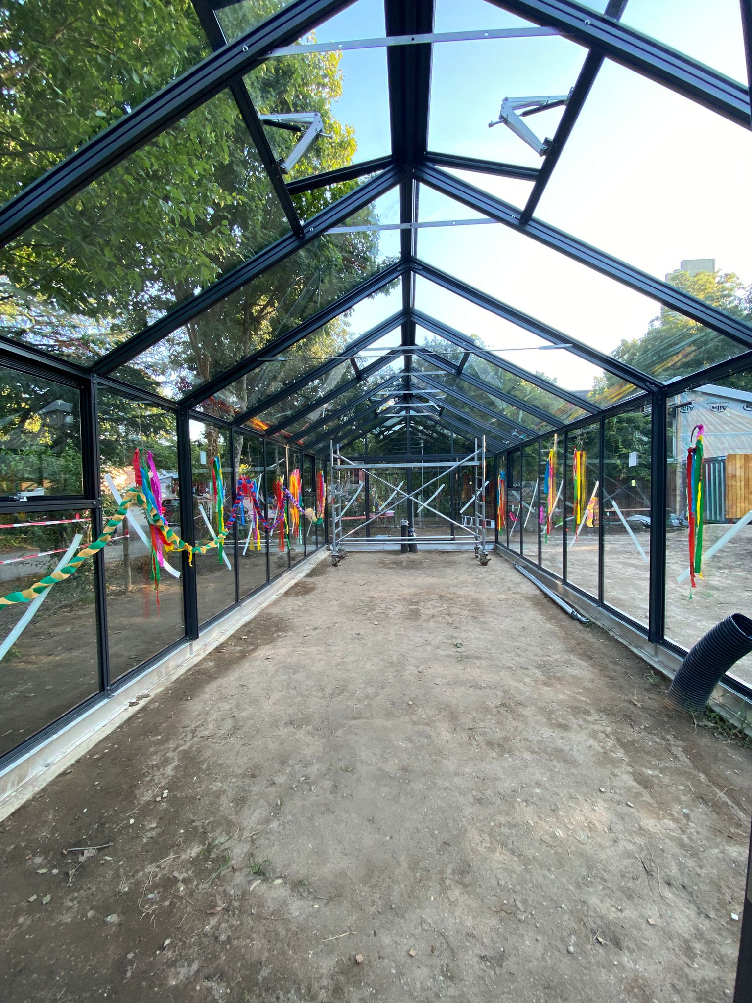 Zudem wurden zwei Baucontainer – ebenfalls auf dem Gartenbaugelände – mit zuvor zugesägten und gestrichenen Brettern ansprechend verkleidet. Allen Beteiligten – allen voran den Schüler*innen – hat die Arbeit an diesen zwei Bauprojekten jede Menge Freude gemacht und sie haben ganz viel gelernt. Besonders beim Mauern waren alle mit Eifer dabei, richteten Mörtel an, spannten Schnüre und setzten rote Klinker. Die Übergabe des Gewächshauses durch die damalige 3a an die Schulgemeinschaft hat mit einem schönen Fest stattgefunden. Jetzt liegt es in den Händen von Baugeschäftsführer Jochen Gaukel, an den Mitarbeitenden der Hausmeisterei sowie an Gartenbaulehrerin Martine Menrad, das „Innenleben“ des Gewächshauses fertigzustellen und das Glasgebäude in Betrieb zu nehmen.