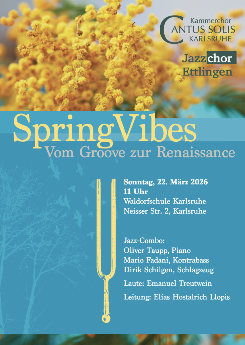 Der Kammerchor Cantus Solis und der Jazzchor Ettlingen gestalten gemeinsam ein Programm voller Leichtigkeit, Wärme und mitreißender Energie, in dem das Ganze mehr ist als die Summe seiner Teile: anspruchsvolle, farbenreiche Chormusik und ein abwechslungsreiches Repertoire mit viel Swing. Eine Mischung aus Renaissance-Klängen, modernen Chorsätzen, jazzigen Harmonien und Groove.